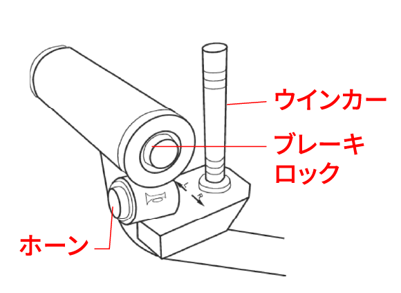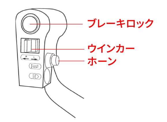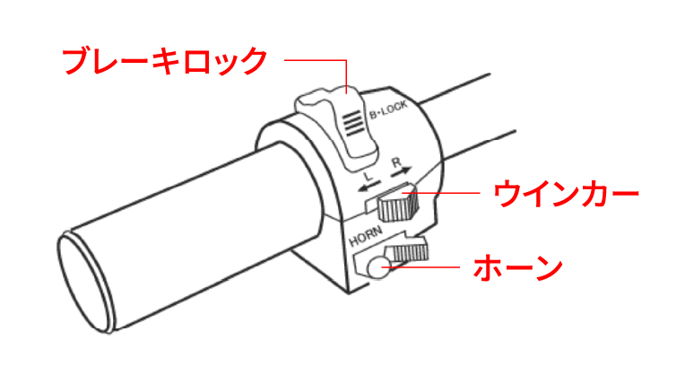 ウインカー、ホーン、ブレーキロックのスイッチが標準装備。
