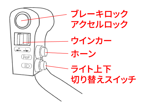 • 運転に必要なウィンカー、ホーン、ブレーキロック等の操作を手元で行なえます。