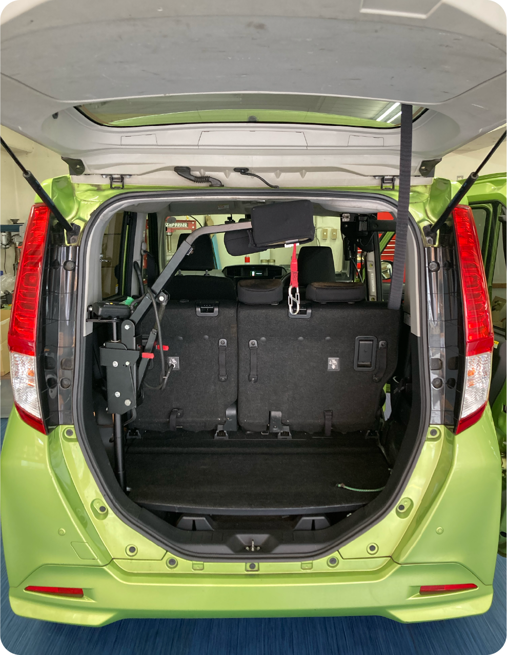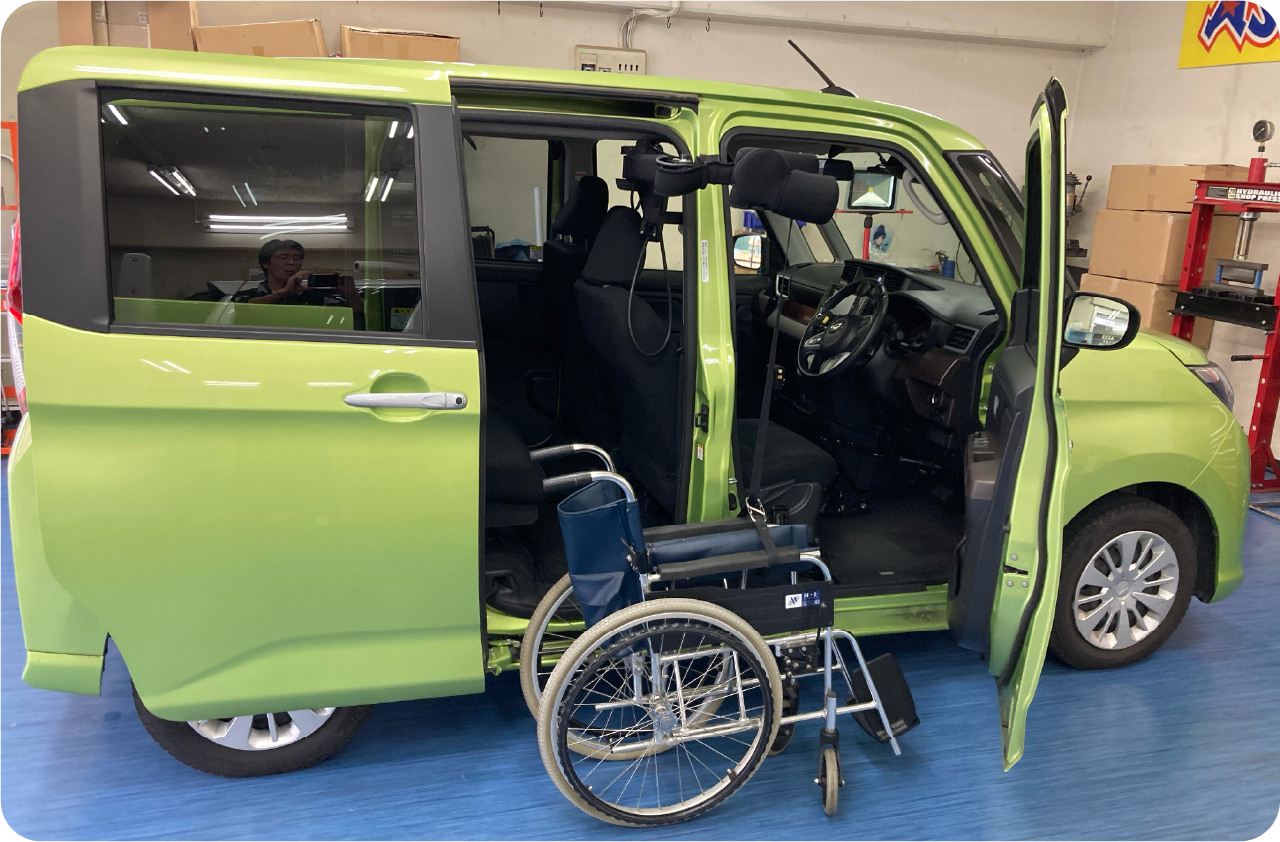- 軽自動車の運転席側スライドドアからでも車いすを収納する事も出来ます。